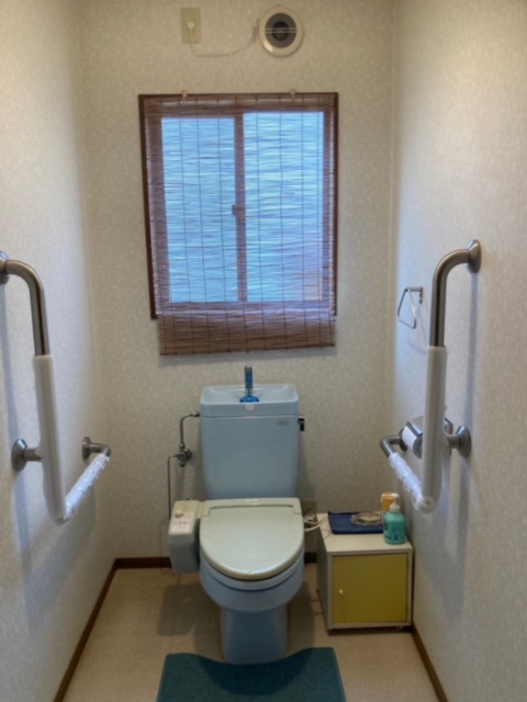 片側の壁に便器を寄せて、手すりは、元からある壁側の手すりと、介助用に跳ね上がり用の手すりを新たに設置し、手すりが使いやすくなりました。 便器も新しいものに取替ました。